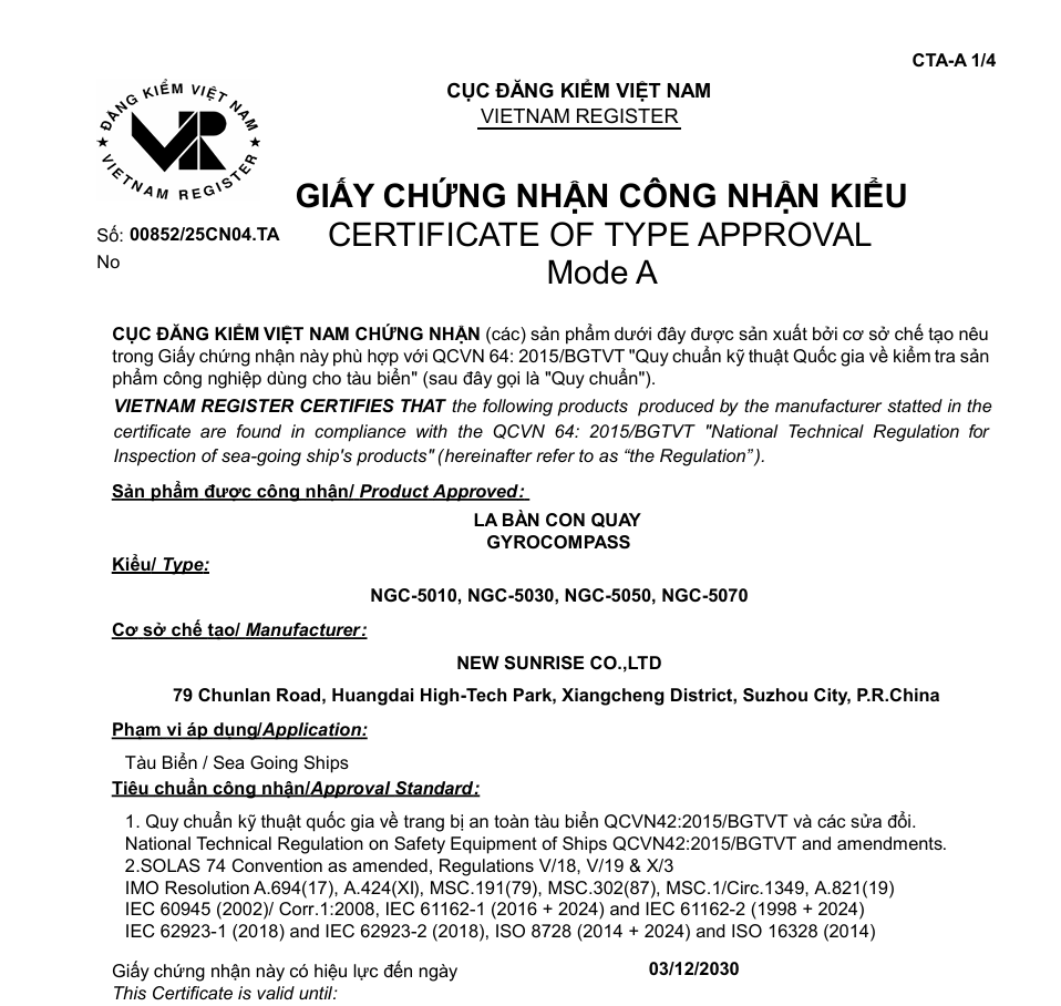 Sản phẩm La bàn quang FOG này đã nhận được EC-TYPE EXAMINATION CERTIFICATE (MODULE B) số MEDB0000AW8 do DNV-GL cấp, chứng nhận tuân thủ Chỉ thị 2014/90/EU về thiết bị hàng hải. Điều này khẳng định NGC-5050 là một thiết bị có độ tin cậy được kiểm chứng và sẵn sàng hoạt động trên các tàu hoạt động quốc tế.